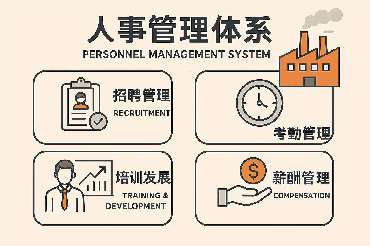 一个完善的人事管理体系包括多个核心模块和运作机制,帮助工厂实现人员的全周期管理。