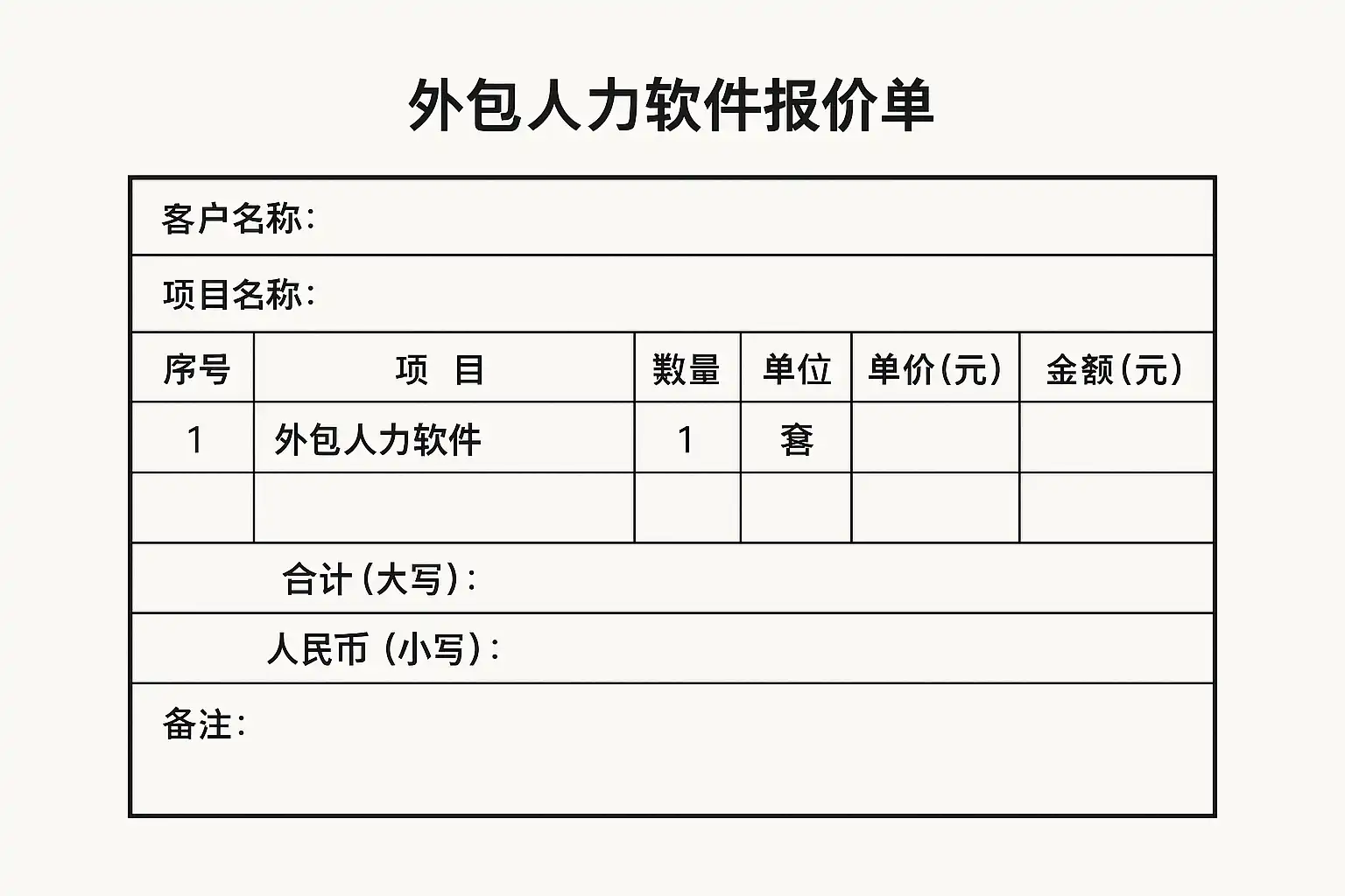 | 包年/包量报价单 | 长期服务、SaaS人力外包项目 | 适合按年/人数/工时计费,便于预算控制 |