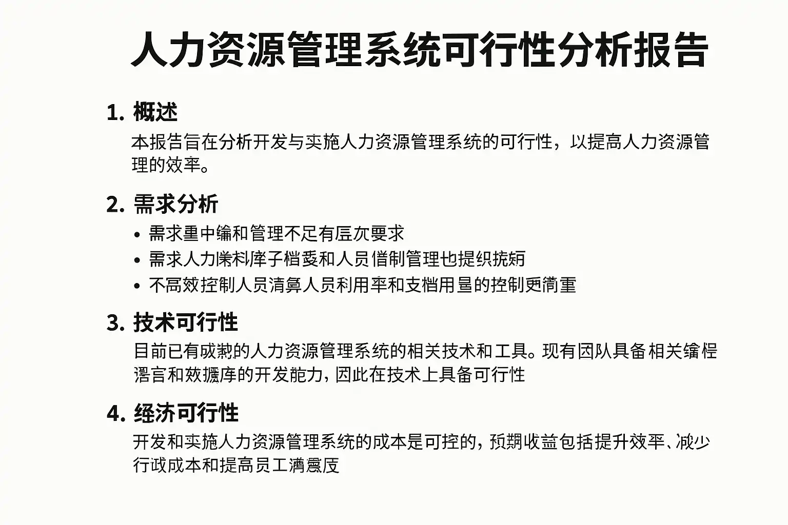 一份高质量的人力资源管理系统可行性分析报告,通常包括以下结构:
