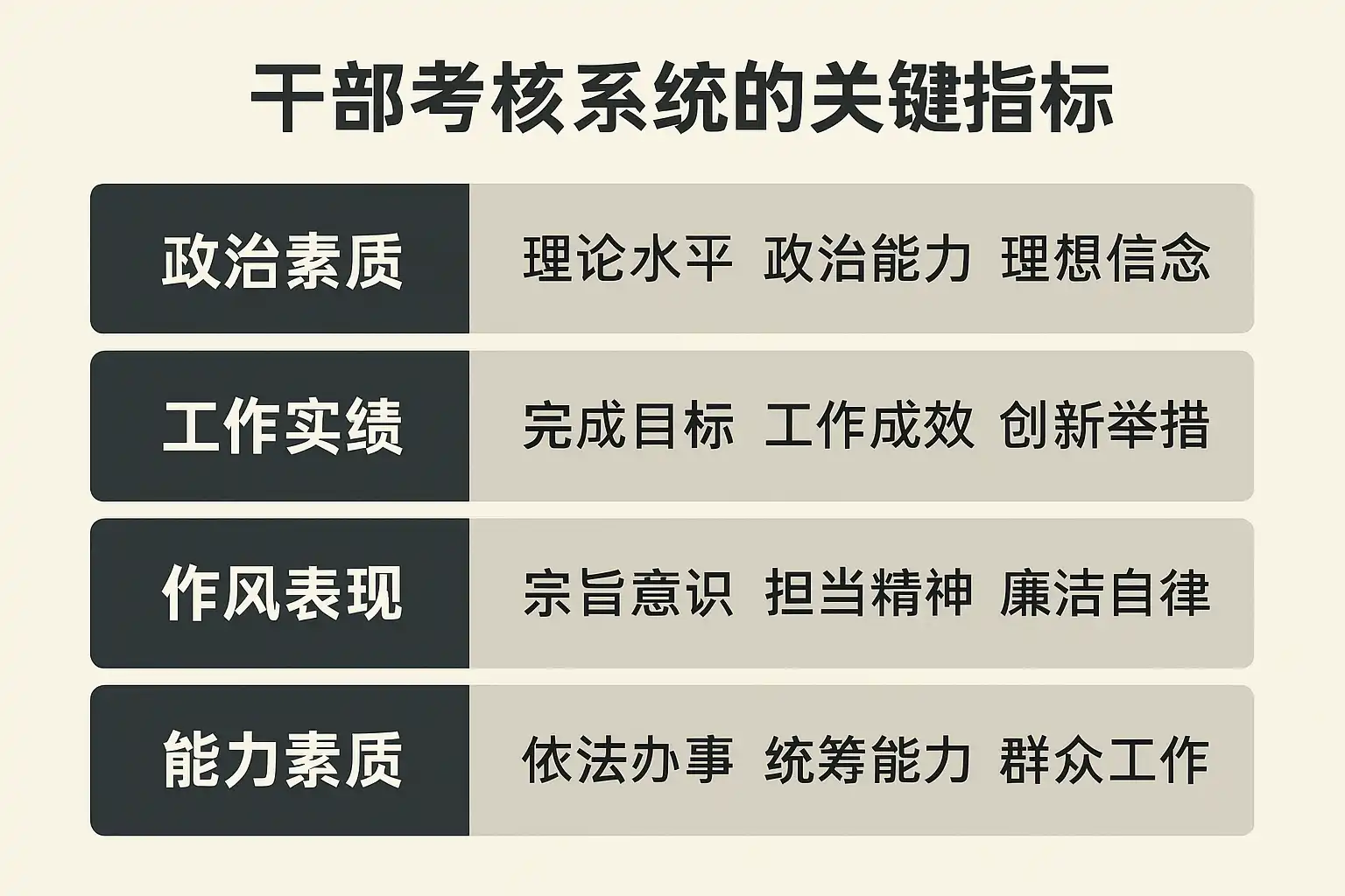 科学评价干部表现,离不开系统、合理的指标体系设计。常见的干部考核关键指标体系如下: