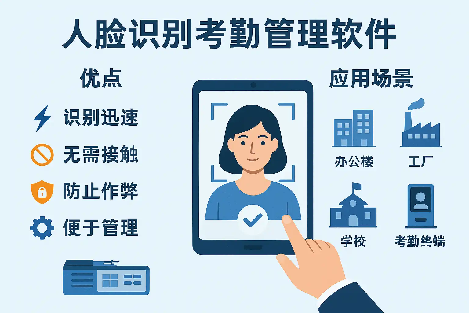 | 工厂车间 | 环境复杂,手指/卡片易受损 | 无需接触,识别稳定,便于统计 |