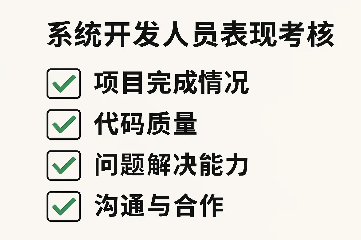 系统开发人员考核方法主要包括绩效指标考核、代码质量评估、项目完成度和团队协作能力四大类。具体评估指标如下: