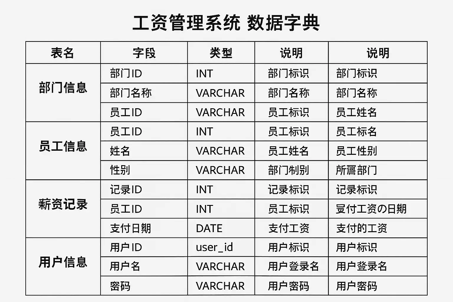 | 需求分析 | 明确系统核心业务流程,包括工资计算、发放、报表等环节涉及的数据。 |