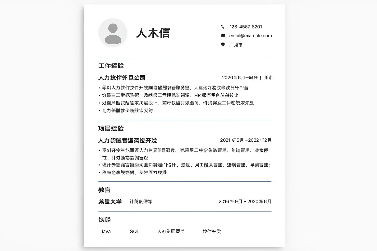 - 分级标题:使用清晰的一级、二级标题区分技能、项目经验、教育背景等内容。