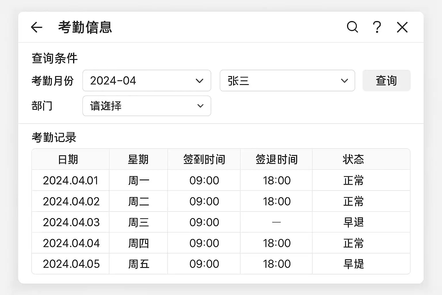 | 设定查询条件 | 输入员工姓名、工号、部门、时间区间等筛选条件 |