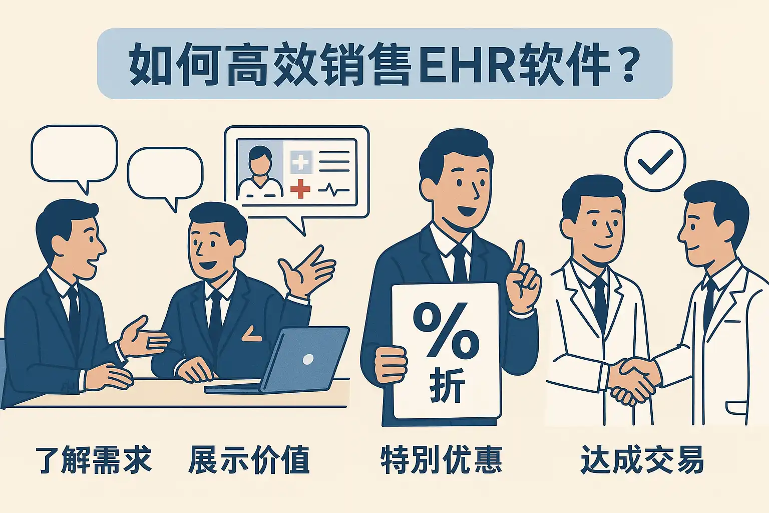 EHR软件高效销售,需系统把握行业挑战,精准定位客户需求、展示差异化价值、有效处理客户疑虑、构建信任、优化演示与跟进,并借助数据驱动持续提升。建议销售团队: