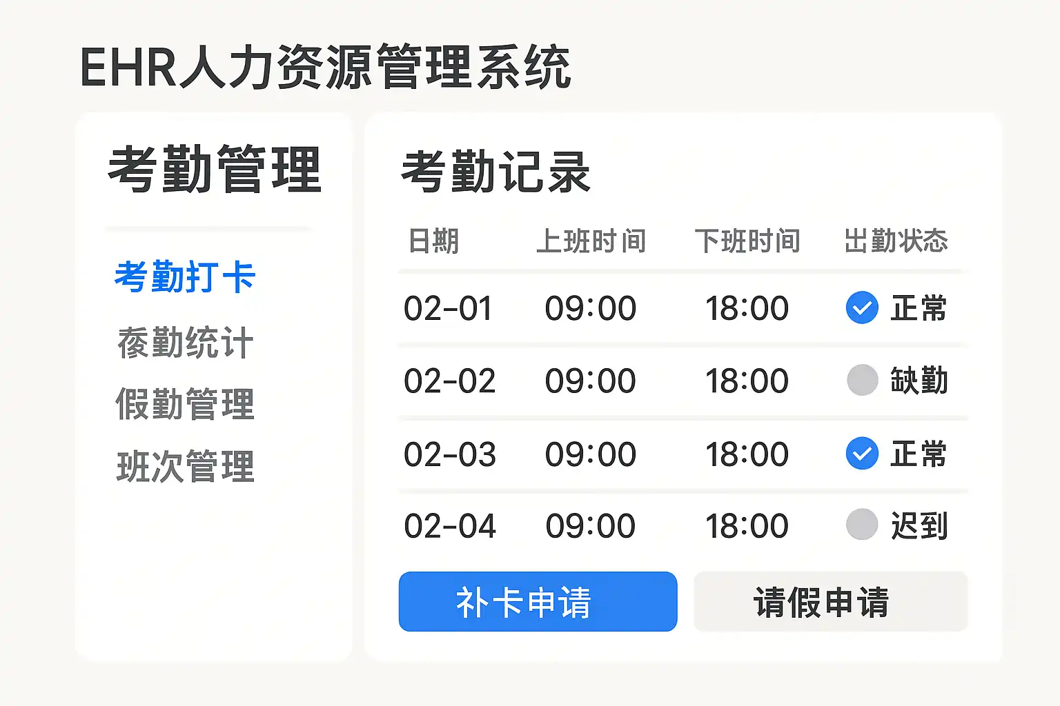 - 硬件集成:EHR系统与门禁、指纹打卡机、人脸识别设备等硬件联动,实现员工打卡数据实时录入。