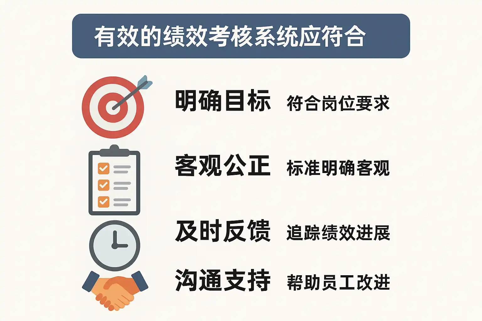 | 目标明确 | 对齐企业战略,分解为部门/岗位目标 | 确保考核方向与组织一致 |