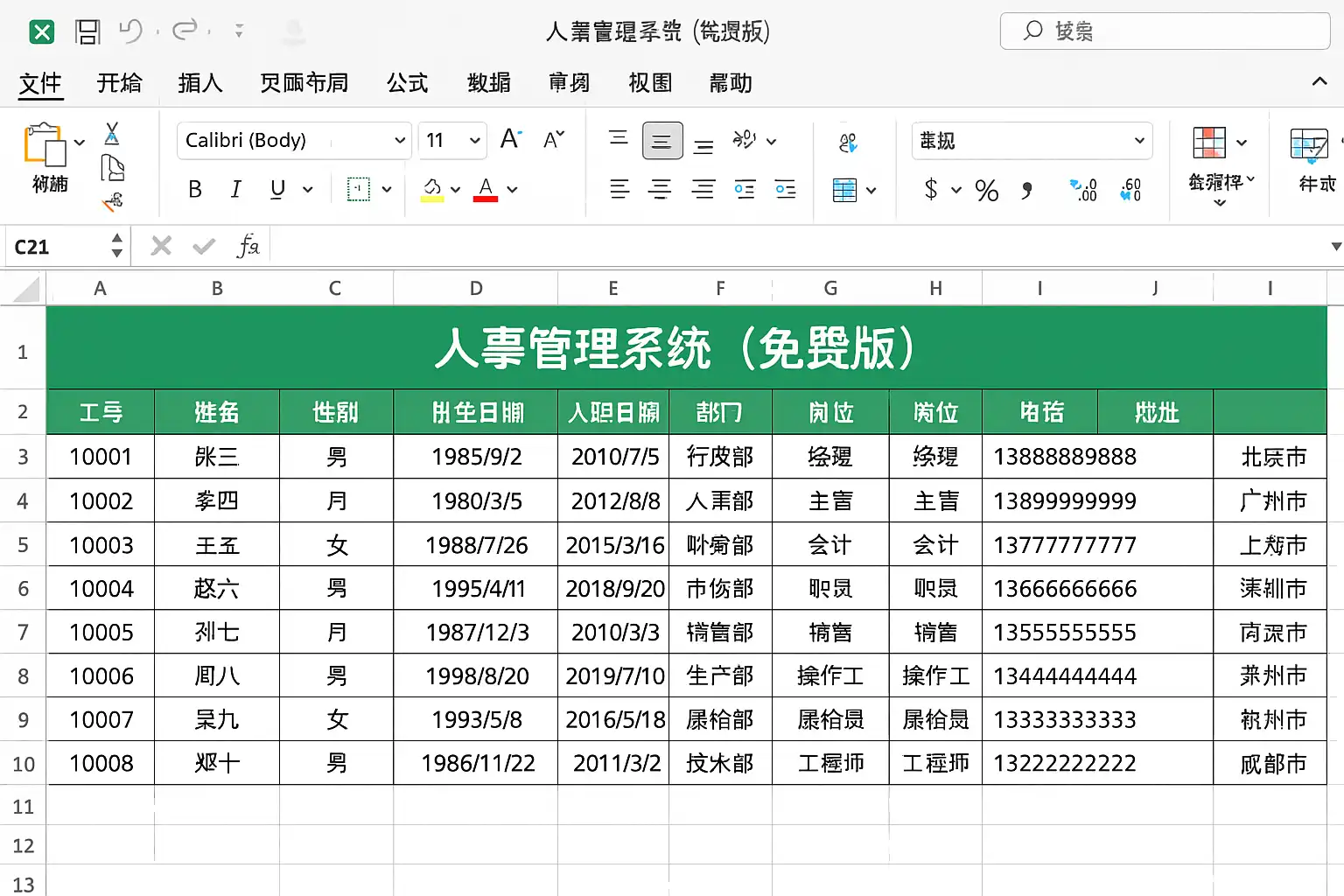 免费版Excel人事管理系统通常包含以下核心功能:
