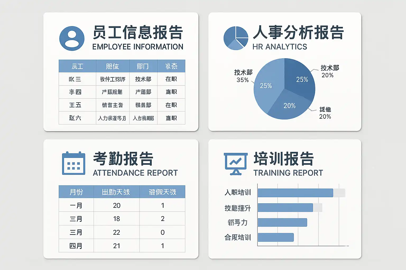 - 员工信息报告:汇总员工基本资料,支持按部门、岗位筛选,便于人员结构分析。
