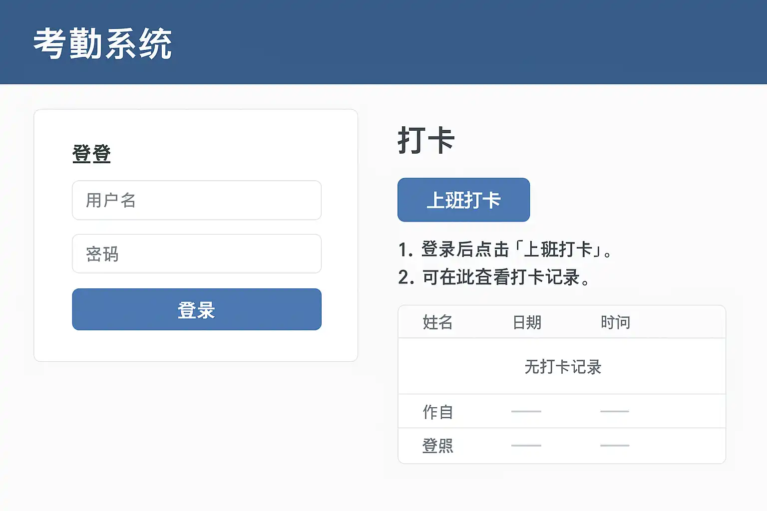 登录成功后,用户将进入考勤系统的首页。不同系统界面风格不同,但核心功能布局大致相似,包括打卡、考勤记录、请假申请、异常处理、报表导出等。