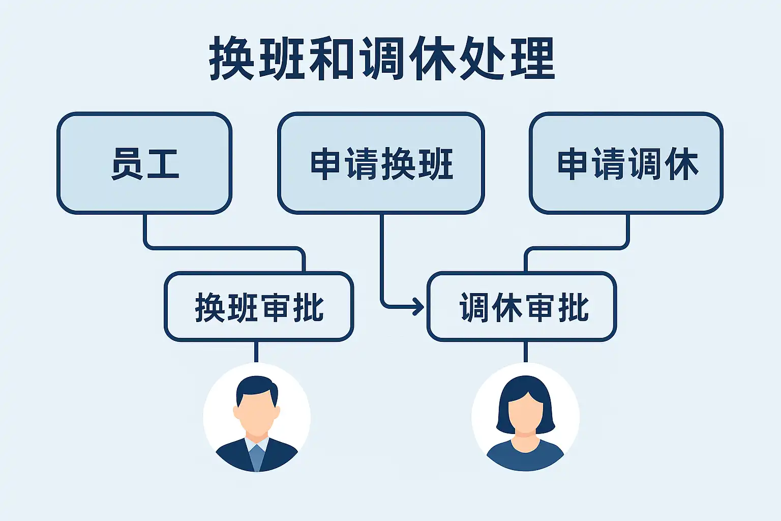 - 自动化审批流:系统自动识别换班申请,按权限级别分配审批任务,减少人工干预。