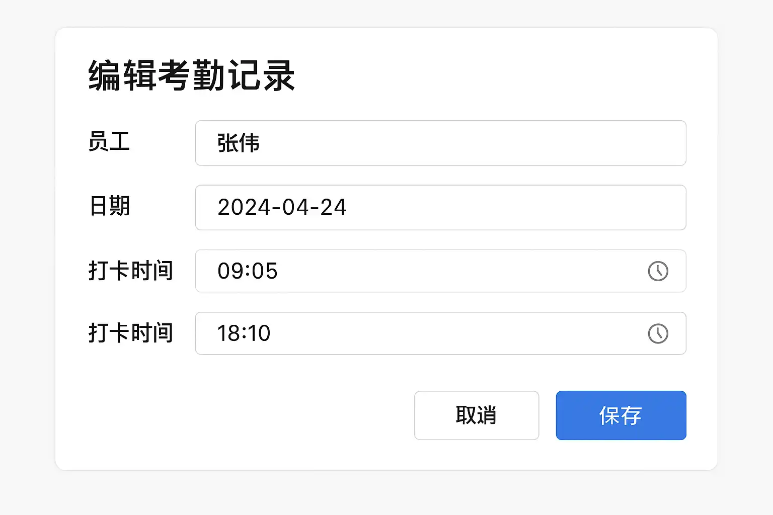 - 点击“编辑”按钮,调整打卡时间字段,确保时间格式符合系统要求(例如:HH:mm:ss)。