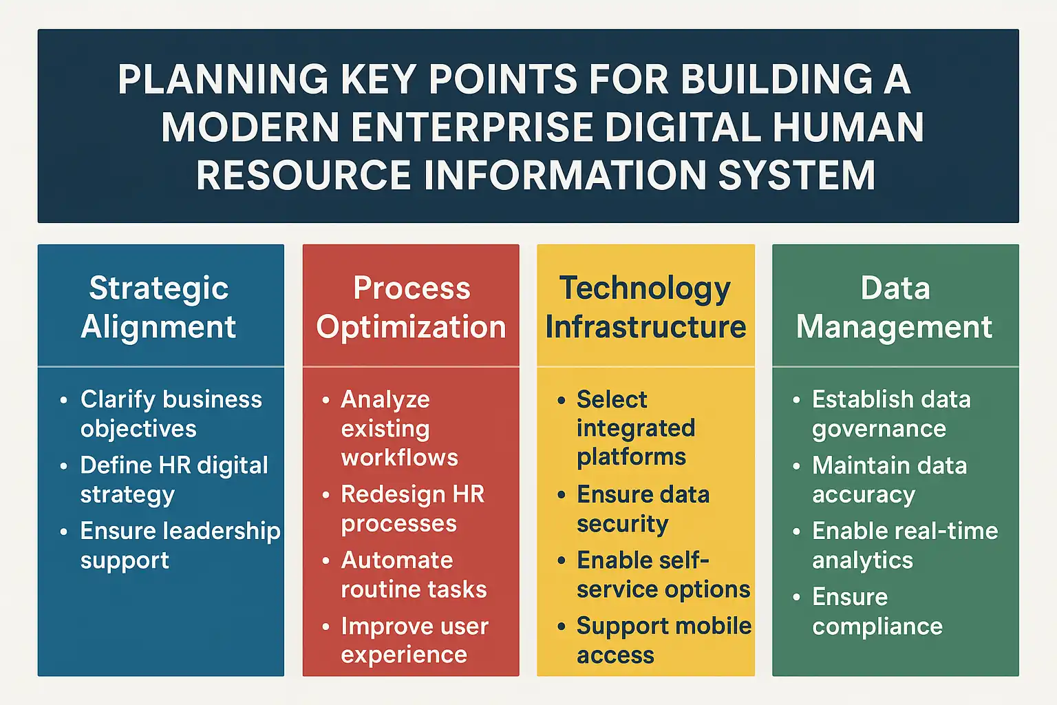 在数字人力资源信息系统建设与实施过程中,企业需关注以下成功因素与常见挑战:
