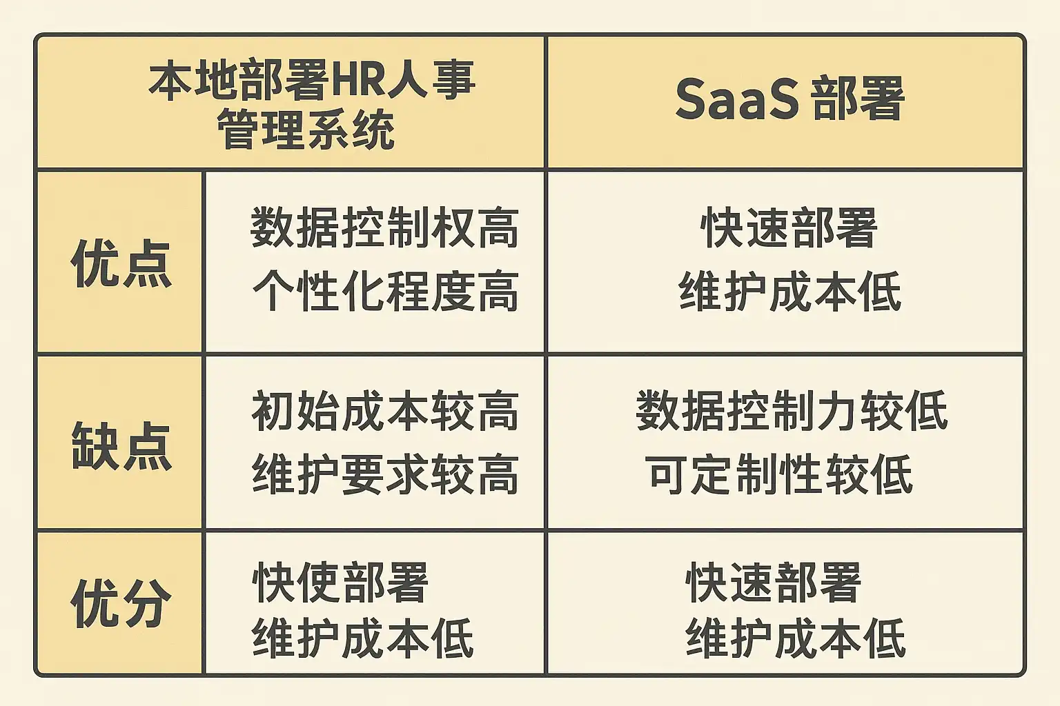 首先,我们通过表格总结本地部署与SaaS部署的核心对比,以便直观了解两者在HR人事管理系统应用中的主要区别。