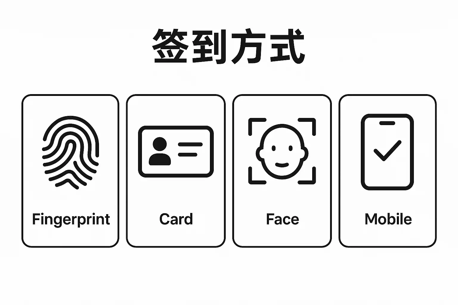 | 二维码签到 | 手机/二维码设备 | 低 | 高 | 会议、活动现场 |