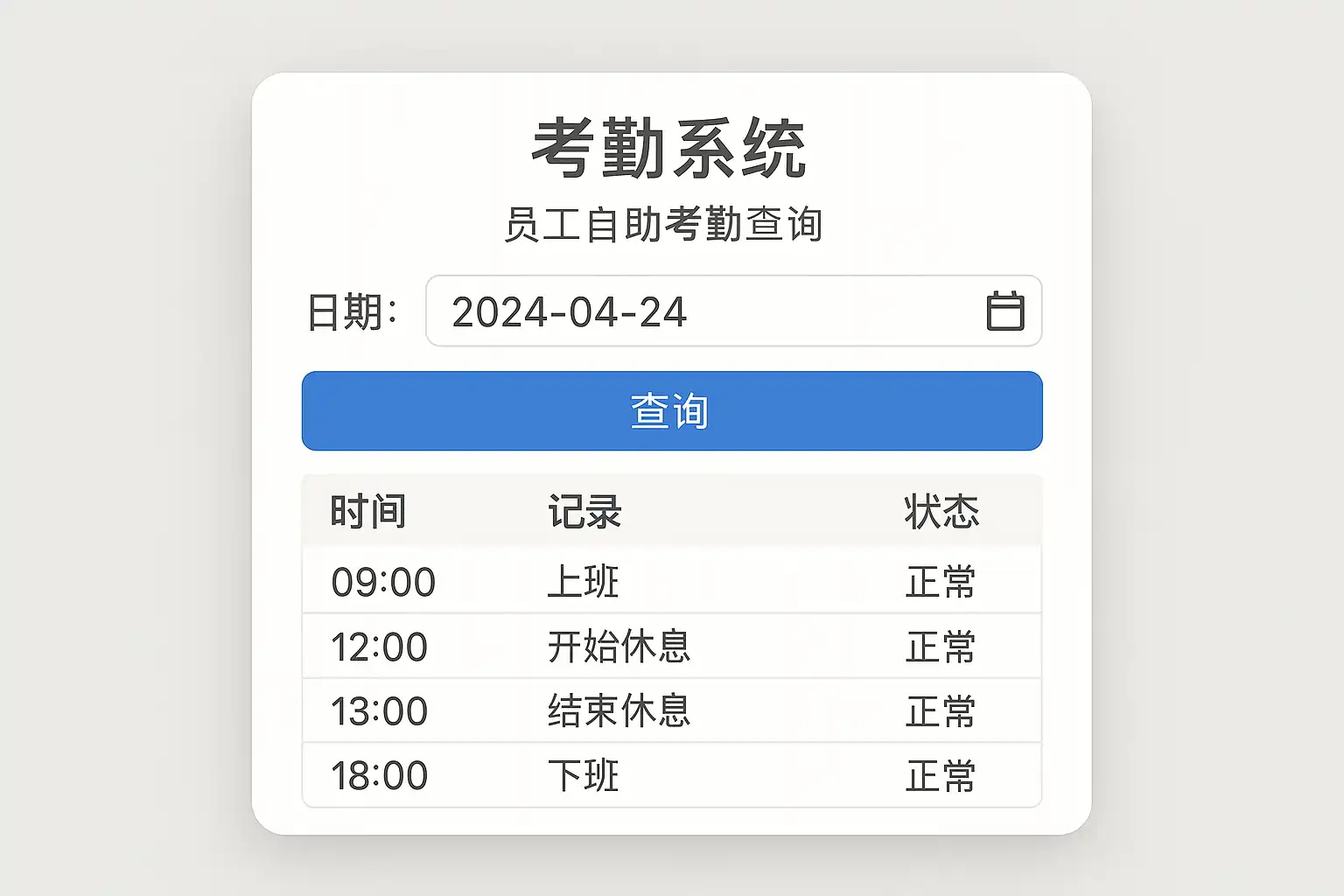 | 历史记录查询 | 可按天、周、月等维度查询历史考勤数据 |