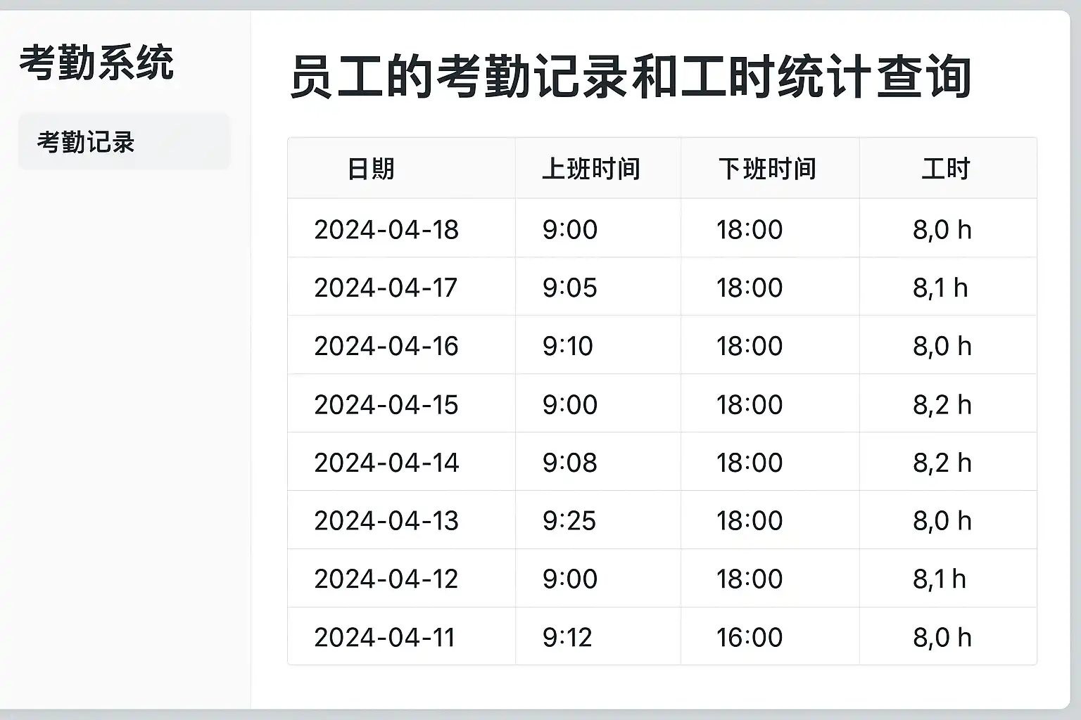 | 工时统计 | 自动计算每日/每月工时 | 薪资结算、绩效评估 |