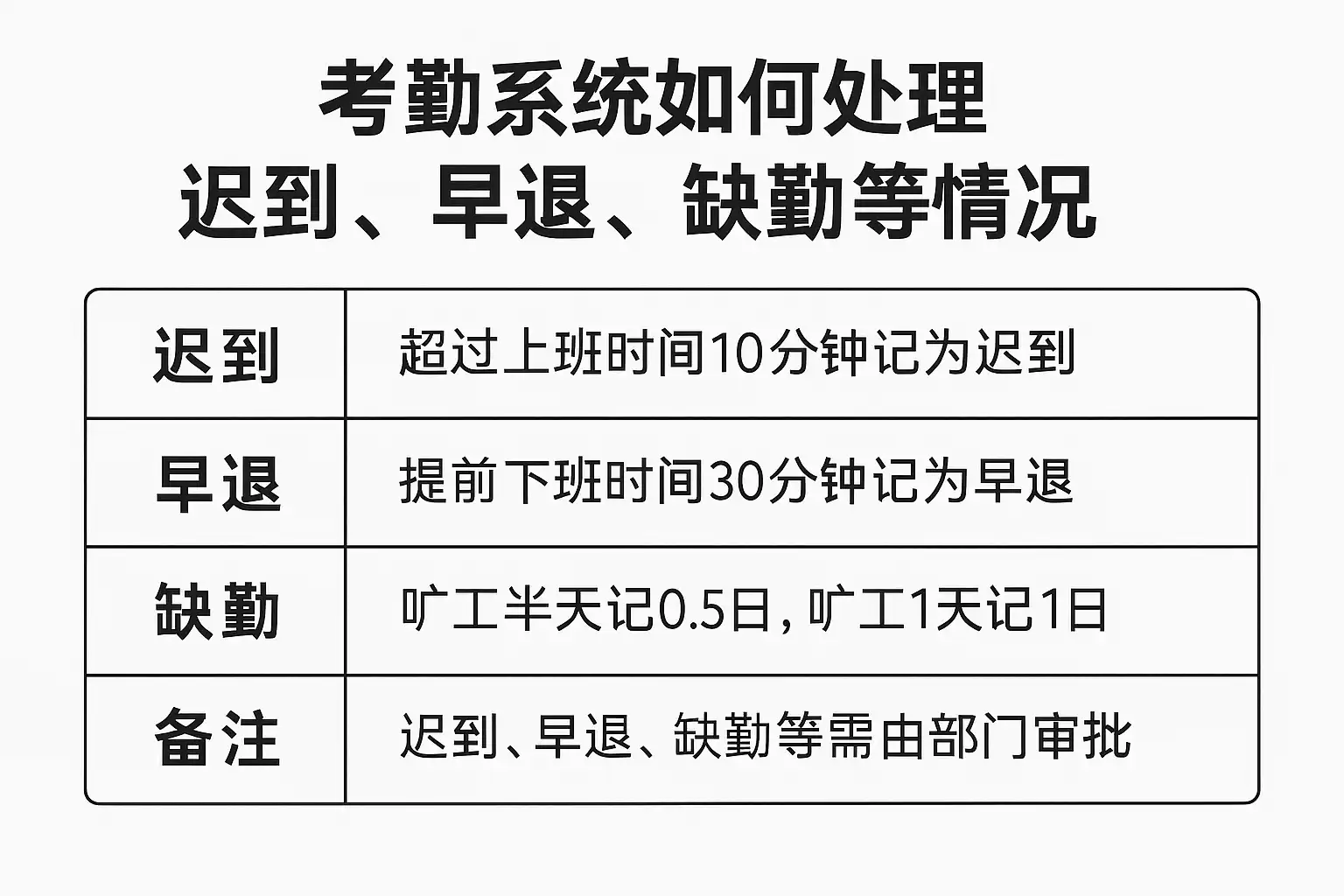 - 设定迟到、早退、缺勤的判定标准及处理细则;