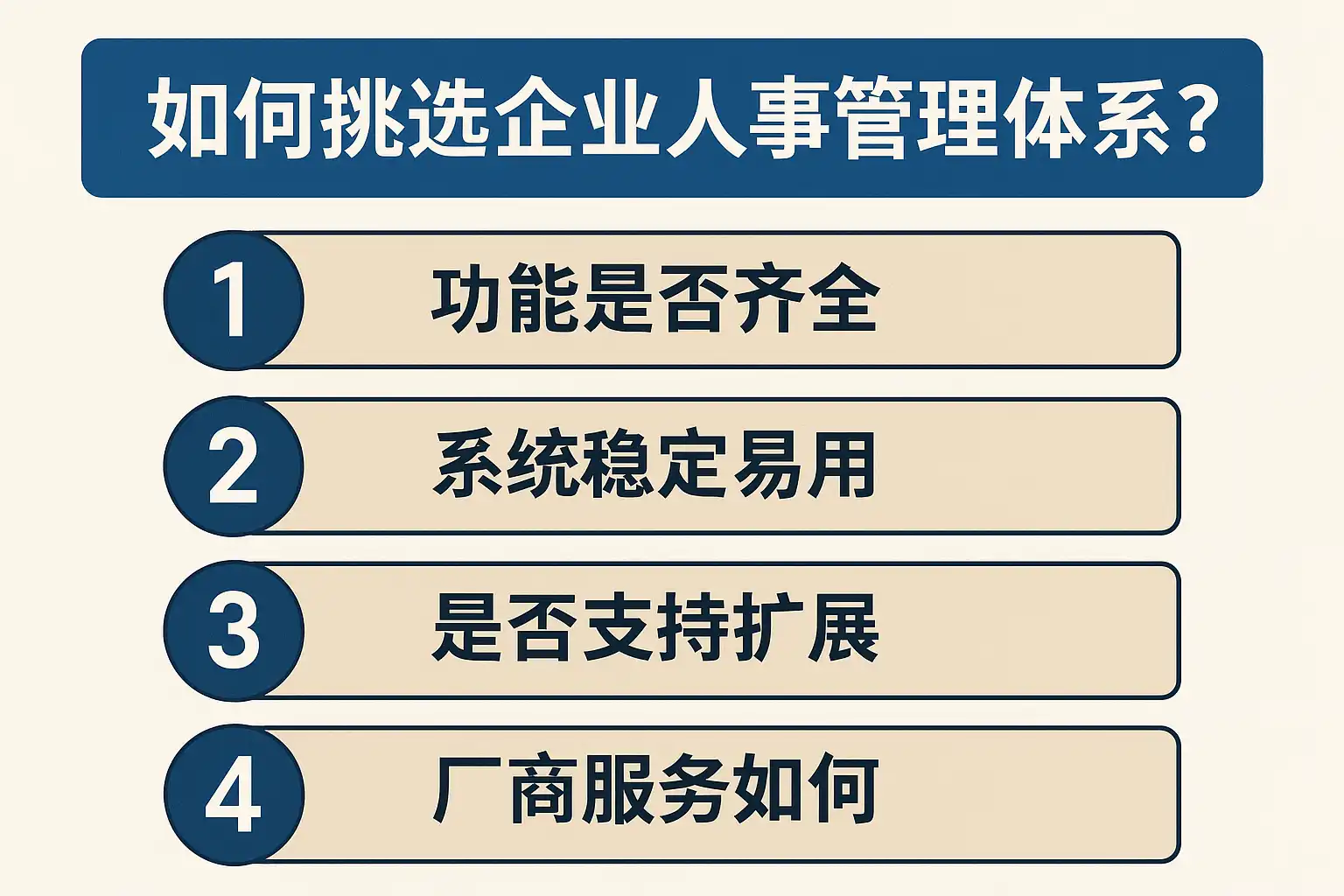企业挑选人事管理体系,需重点关注系统适用性、数据安全、功能丰富性、易用性和服务能力。建议企业: