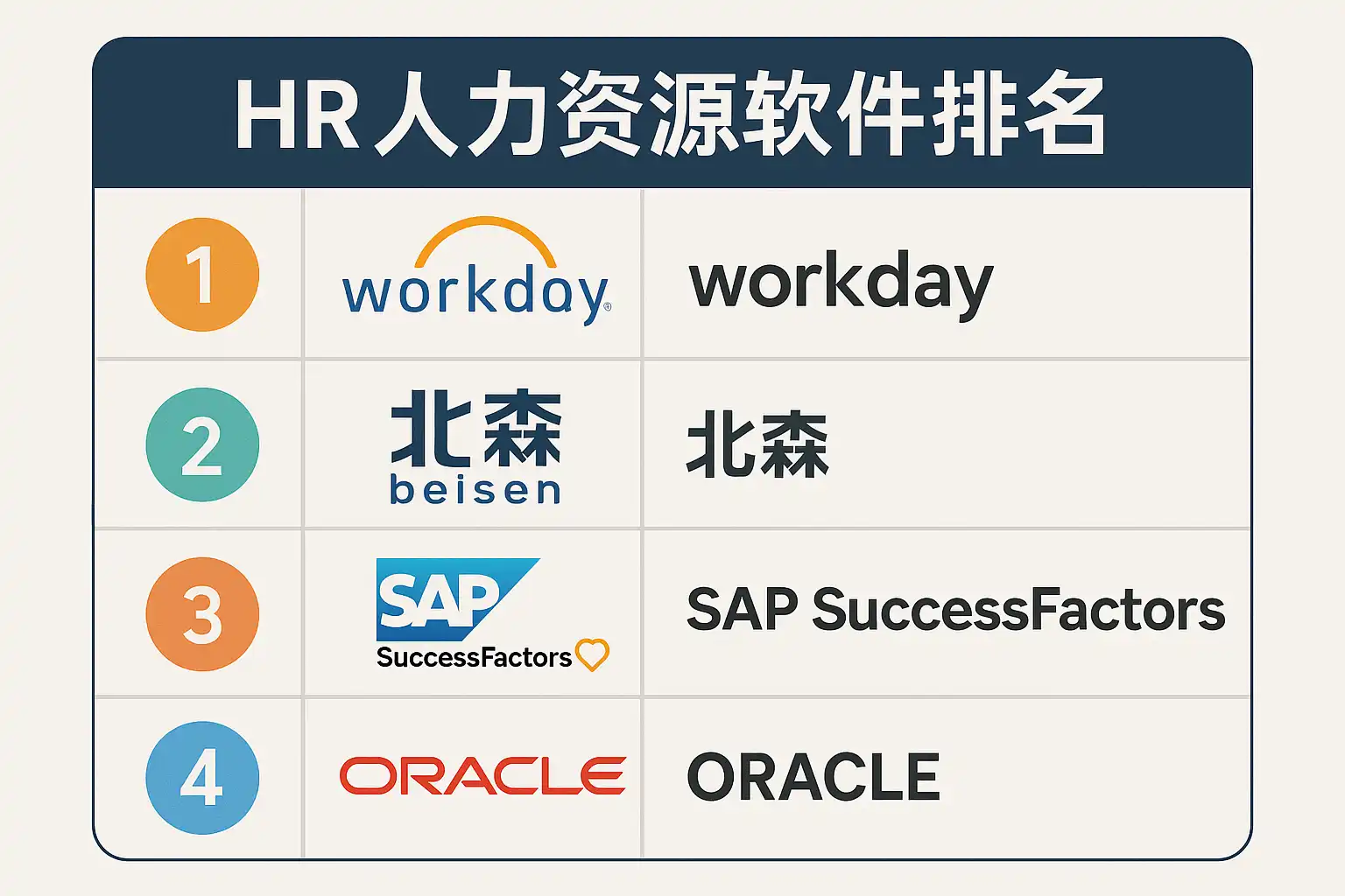 | 3 | Workday | 大中型企业 | HR+财务一体化 | 云端架构、移动化强 | 订阅制 |