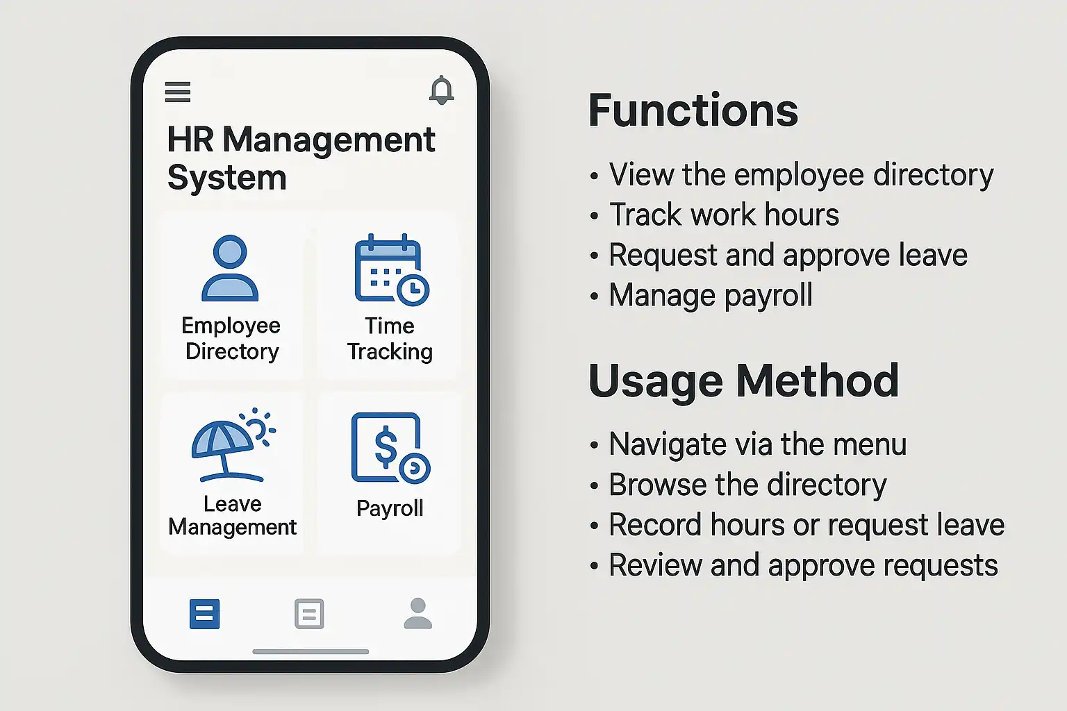 现代企业采用移动人力系统APP,旨在优化人力资源管理流程,实现随时随地办公。以下为主要功能列表: