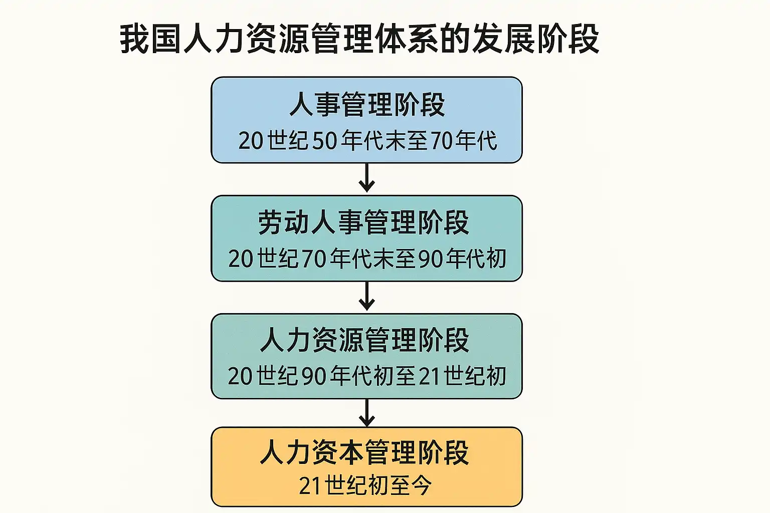 | 人力资源管理阶段 | 20世纪60s-80s | 招聘、培训、绩效、薪酬、劳资关系 | 管理内容拓展,关注员工发展 |