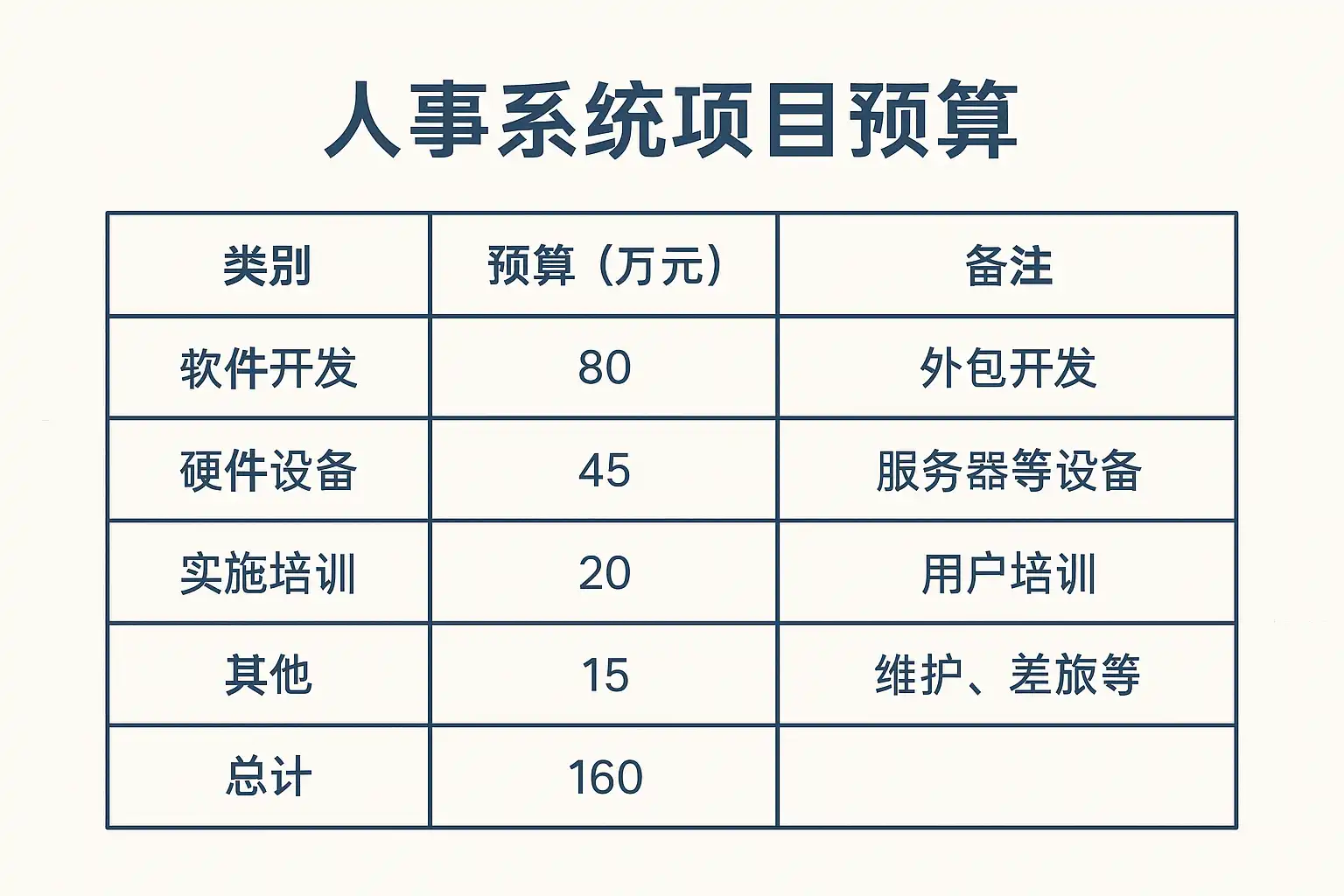 实例说明: 例如,某企业在进行人事系统升级时,因忽略了数据清洗和老系统数据迁移费用,导致项目执行中期必须临时追加预算。细致拆项有助于降低此类风险。