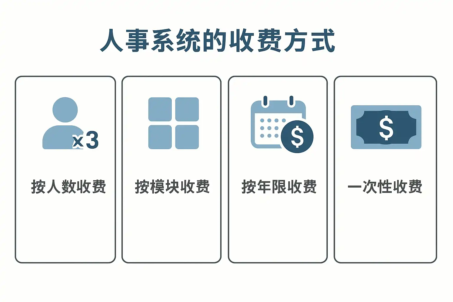 人事系统收费方式主要包括按用户数收费、按功能模块收费、按使用时间收费和一次性购买收费四种:
