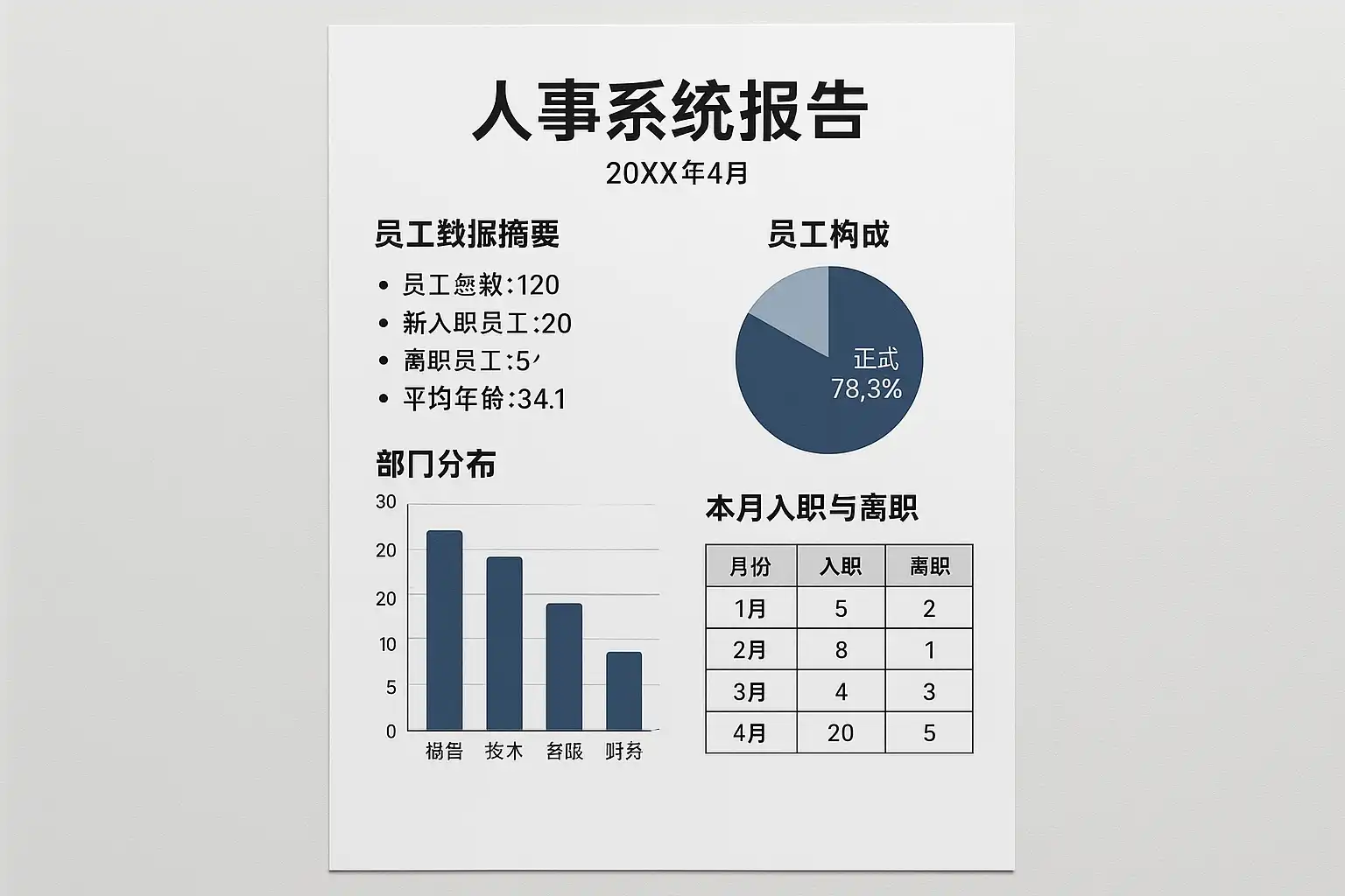 - 使用图表强化数据呈现,如员工构成比例饼图、月度招聘趋势折线图;