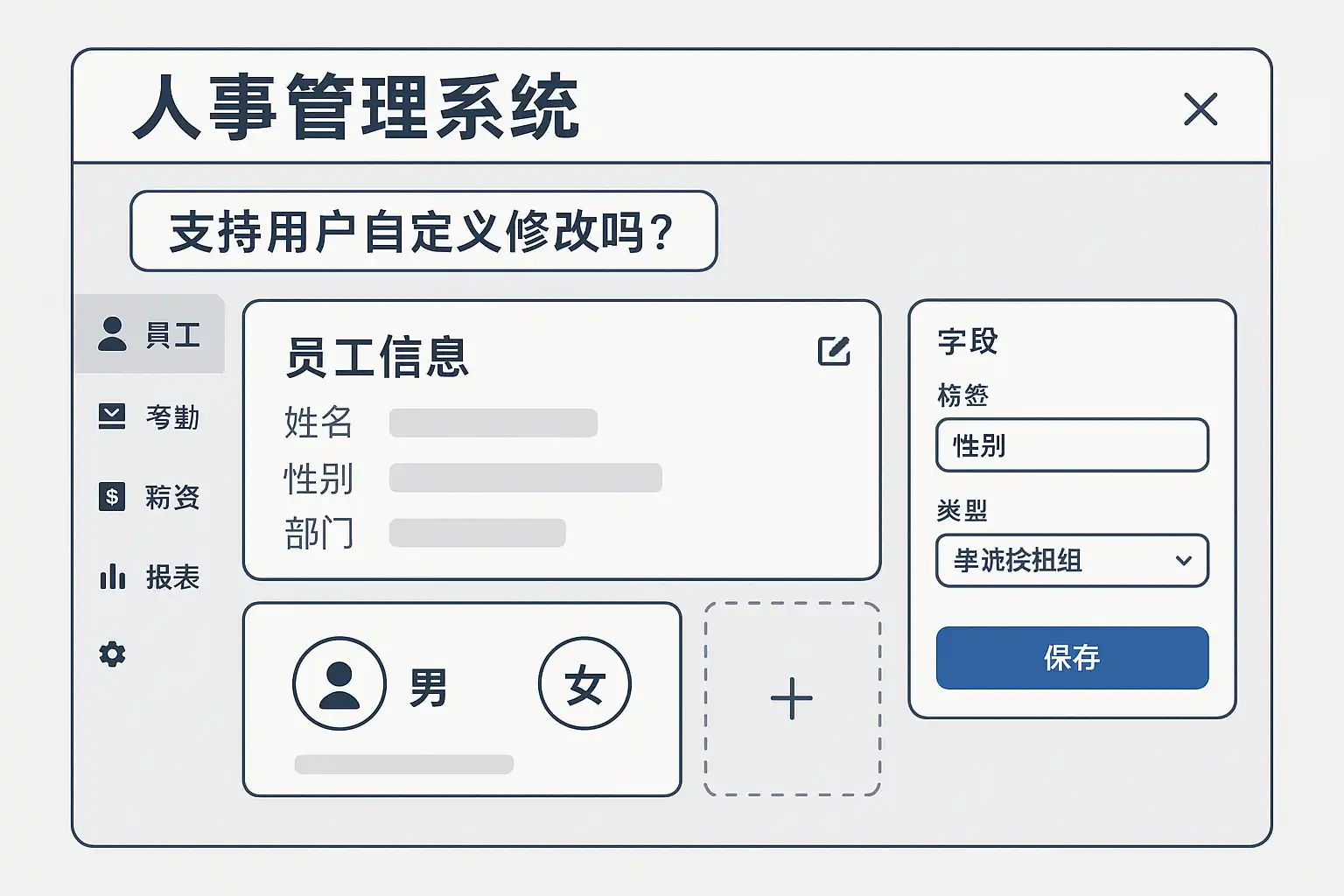| 自定义字段 | 增加、删除、编辑字段类型与属性 | 字段拖拽、设置数据类型、必填项、校验规则等 | 工号、岗位级别、合同类型等 |