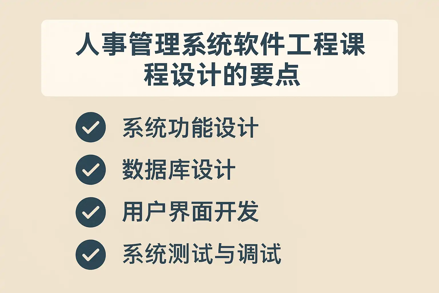 - 测试与维护——包括功能测试和性能测试,确保系统稳定运行。案例:某校人事管理系统课程设计通过模块化架构实现维护效率提升30%。