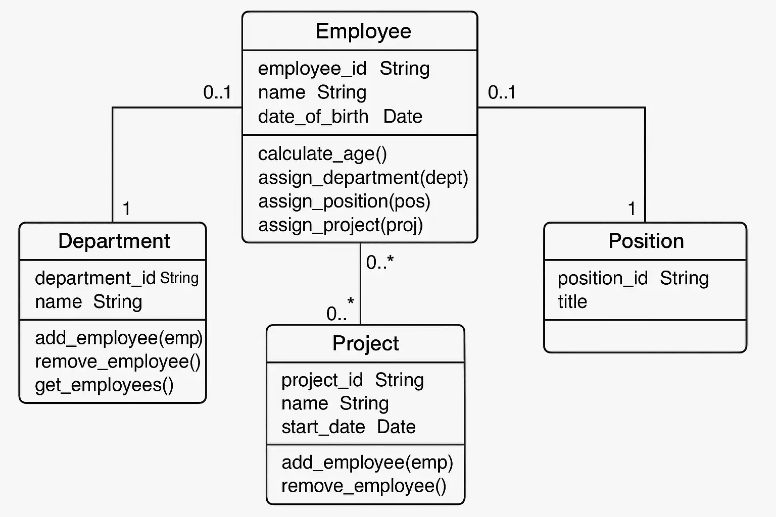 - 方法(Operations): 类可以执行的功能,如添加员工、修改信息等。
