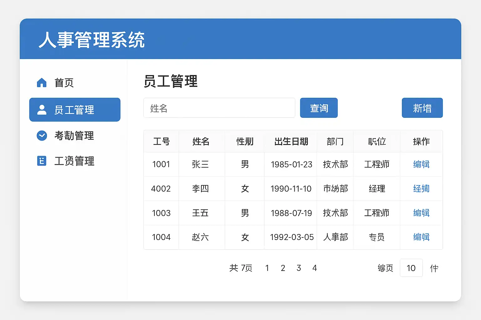 - 员工信息表:包含姓名、工号、联系方式、部门、岗位等字段。