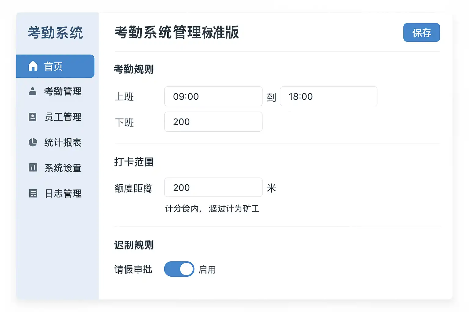 考勤规则是系统自动判定员工出勤状态(正常、迟到、早退、旷工、请假、加班等)的依据。标准版系统一般提供灵活的规则配置界面,管理员可根据实际需求自定义多套规则。