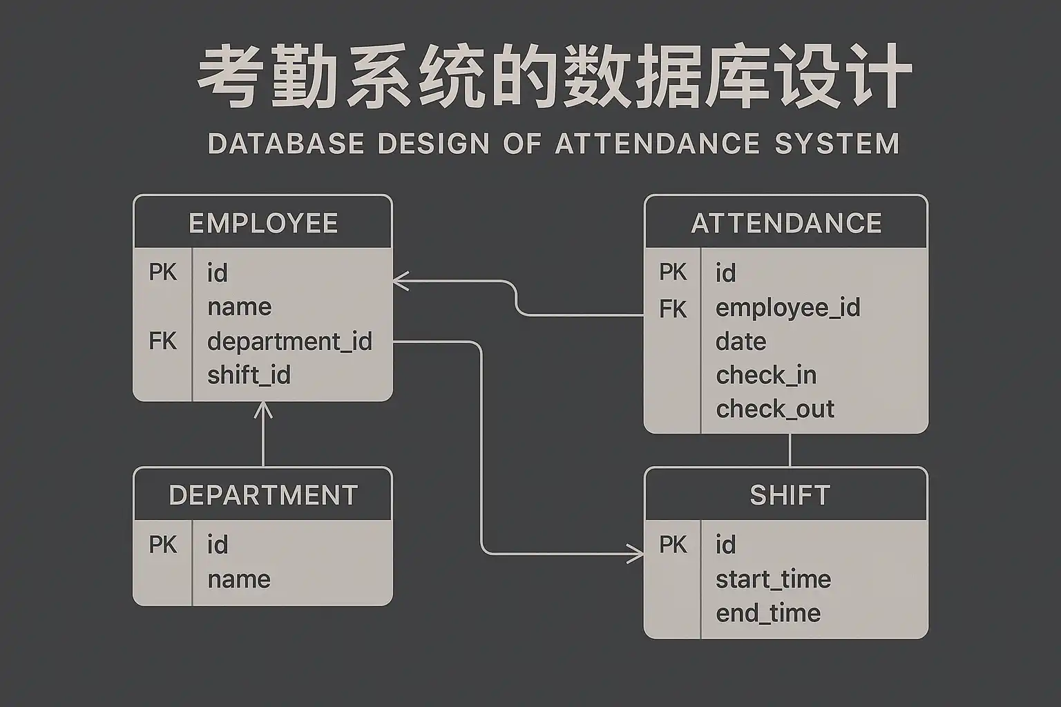 实例说明: 假如某公司有跨部门、跨地点的考勤需求,合理划分员工信息、打卡记录及班次表,并通过外键关联,可以快速查询某员工在某时间段的考勤状态,支持多维度分析与报表生成。