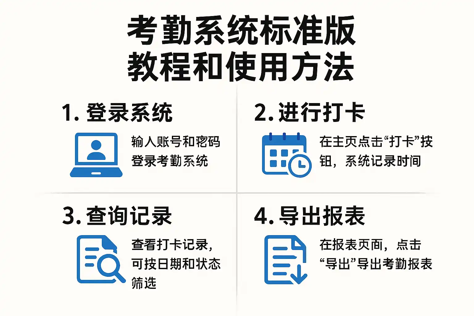 | 数据报表导出 | 统计分析、导出Excel等格式 | 导出月度考勤汇总表 |