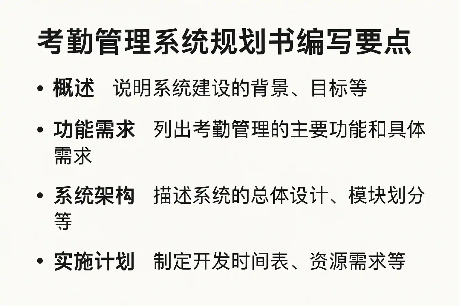 我刚接手公司考勤管理系统的规划书编写工作,不太清楚哪些内容是必须重点写的,想知道考勤管理系统规划书的核心要点包括哪些,才能保证内容全面且有条理。