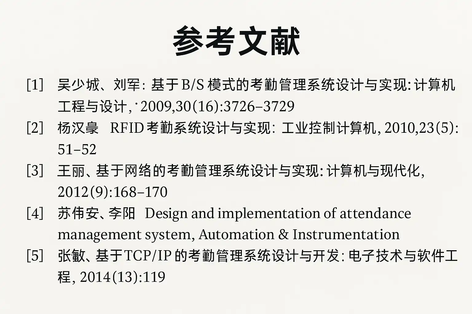 考勤管理系统的开发涉及软件工程、数据库、前后端开发等多方面知识。以下为常见的参考文献类型及具体书目、论文和网络资源:
