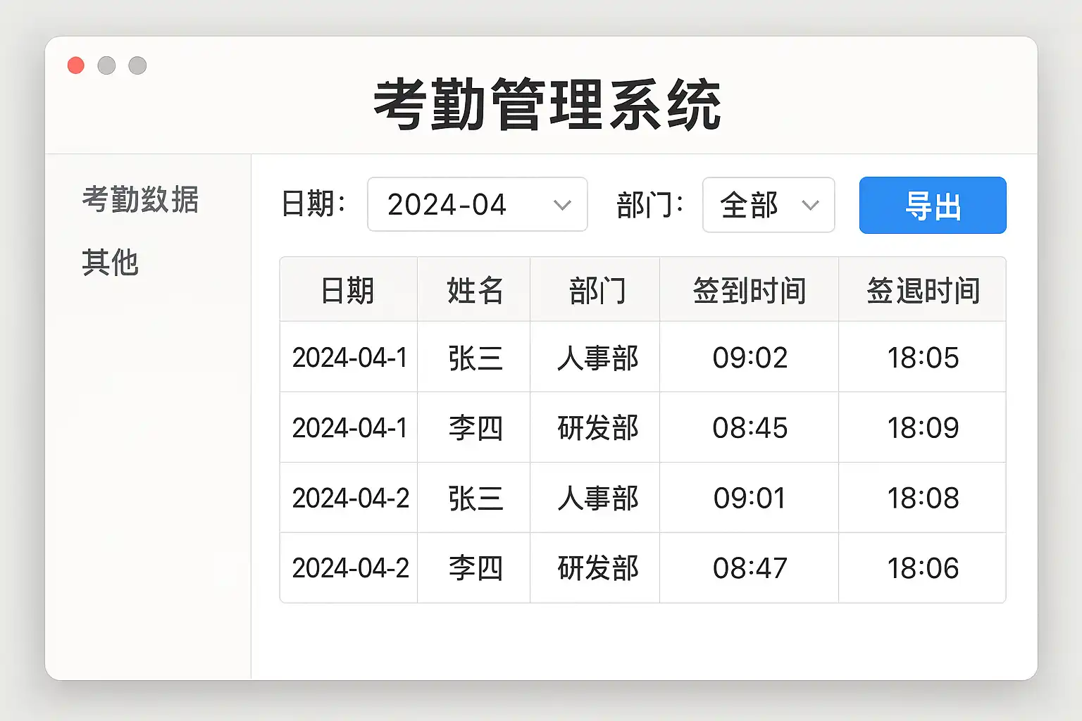 部分企业采用通用数据采集工具或ETL平台(如简道云、帆软等)辅助导出考勤数据。这些工具通常支持可视化配置,无需复杂编码。