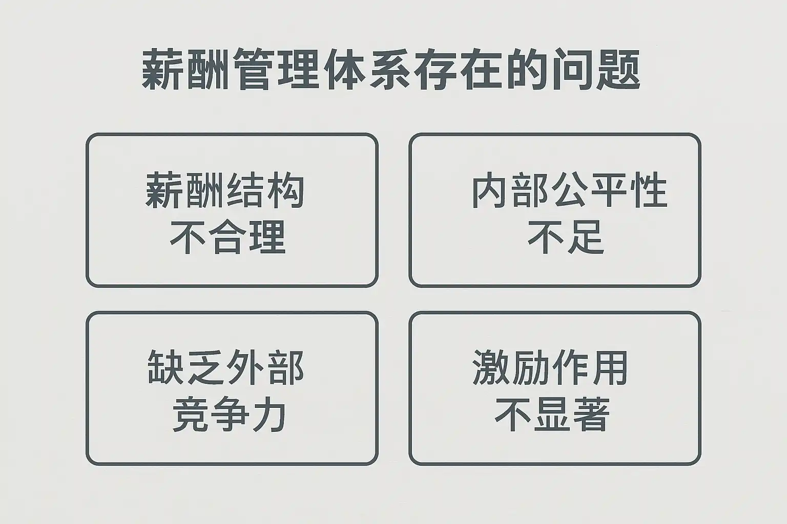 | 1 | 缺乏科学的薪酬结构 | 薪酬体系随意,岗位薪级混乱,晋升不畅 |