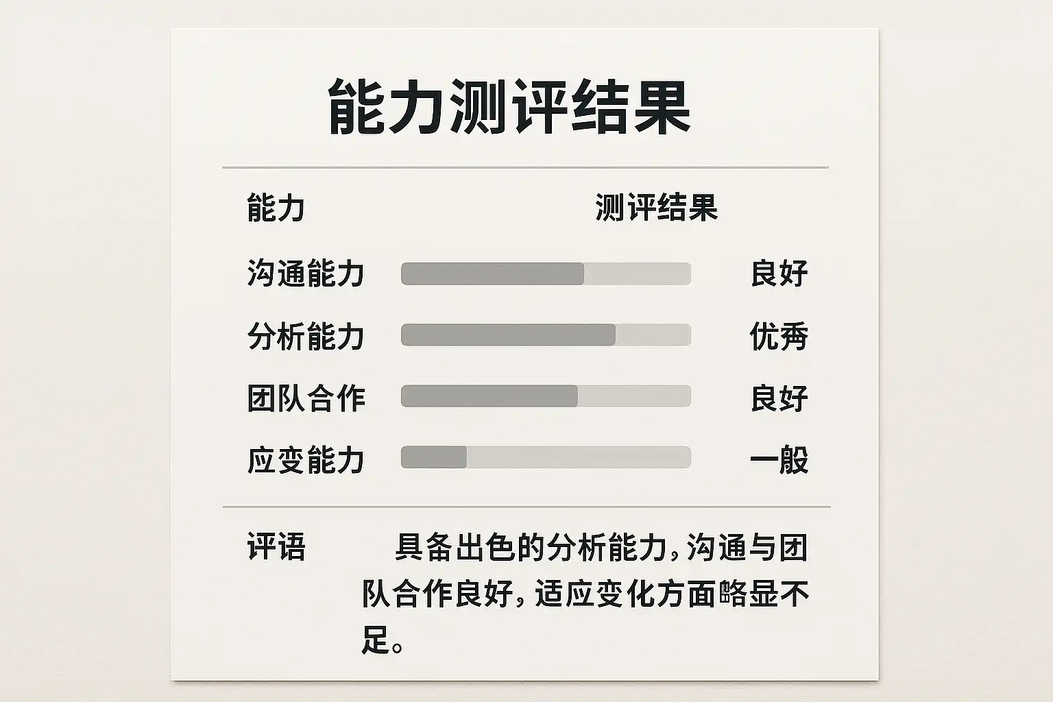 - 先总结测评核心发现(如:沟通能力不足)。