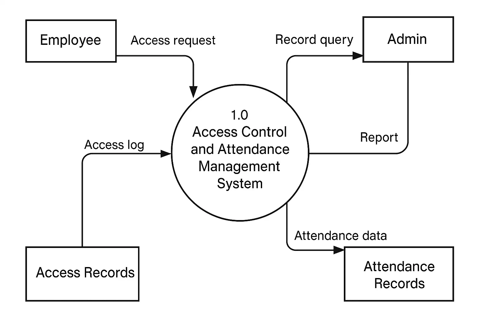 顶层数据流图强调系统与外部实体的整体数据流动,适合快速理解系统边界及核心功能模块。例如,门禁考勤系统的顶层DFD包含“员工、门禁设备、管理员、报表”等外部实体,展现数据的整体流向。