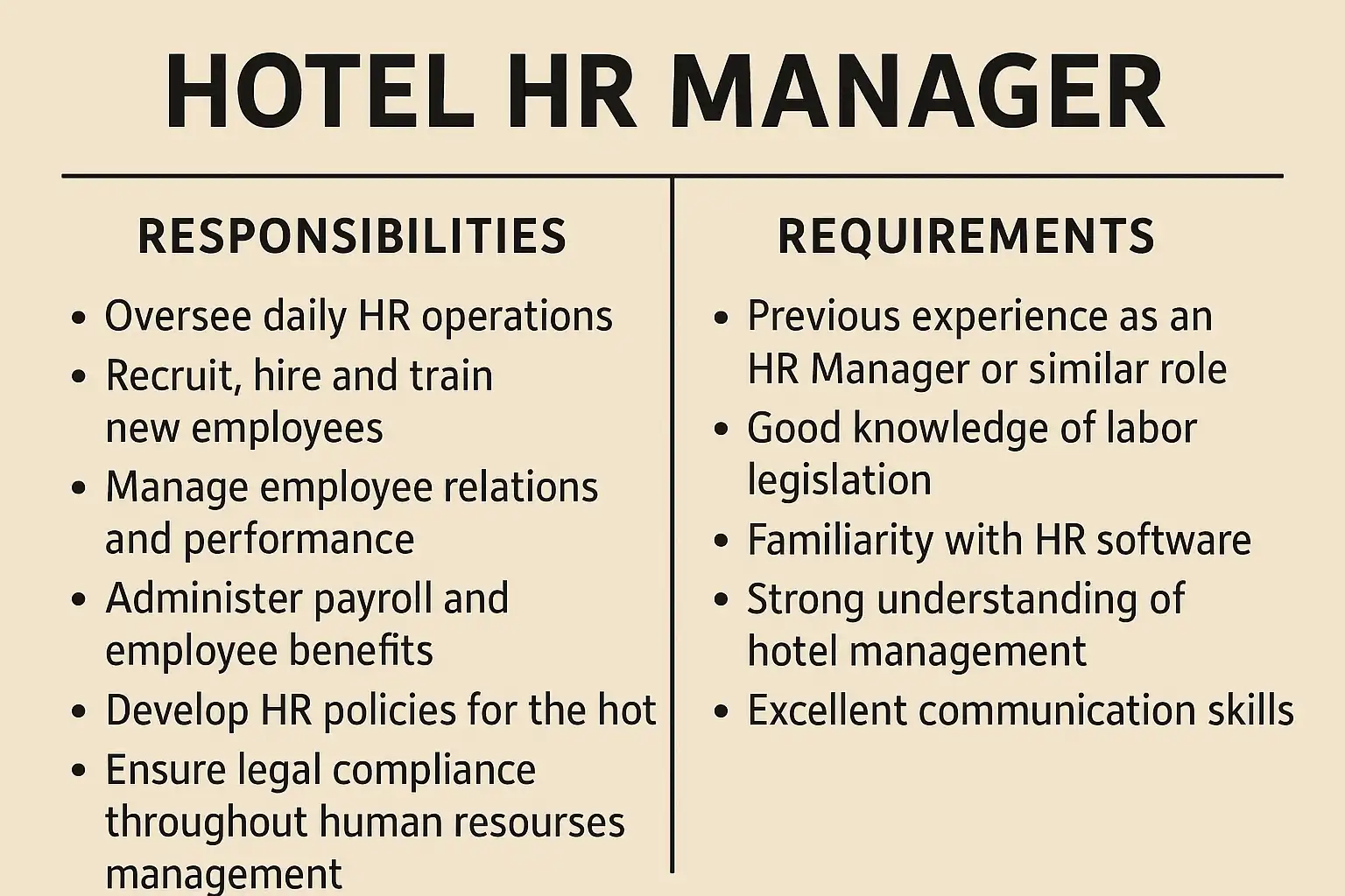 | 学历要求 | 本科及以上学历,优先人力资源管理、酒店管理相关专业 |