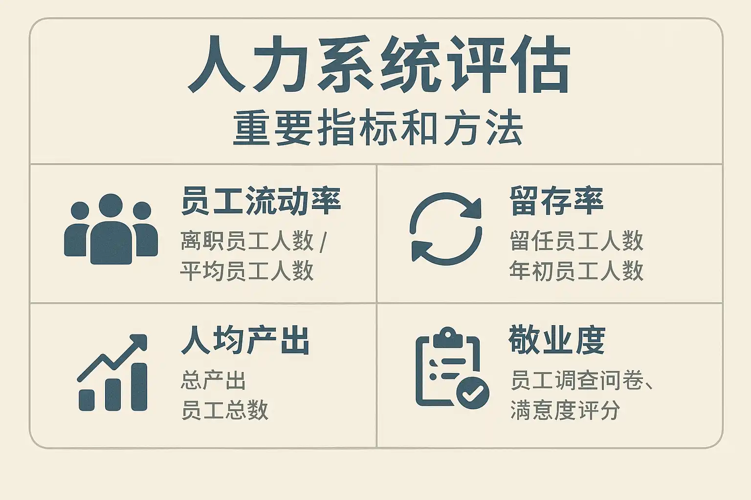 人力系统评估的重要指标主要包括员工绩效、员工满意度、离职率、培训效果和招聘周期。具体指标如下: