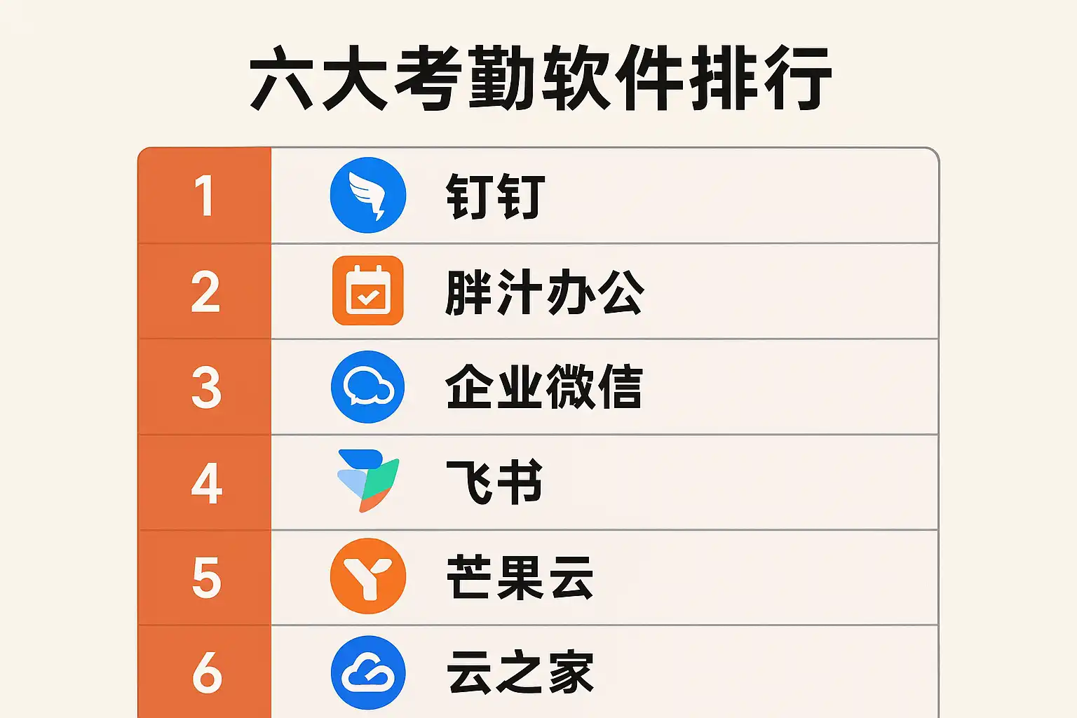 | 6 | 云之家考勤 | 移动办公、智能打卡、OA集成 | 中大型企业 |
