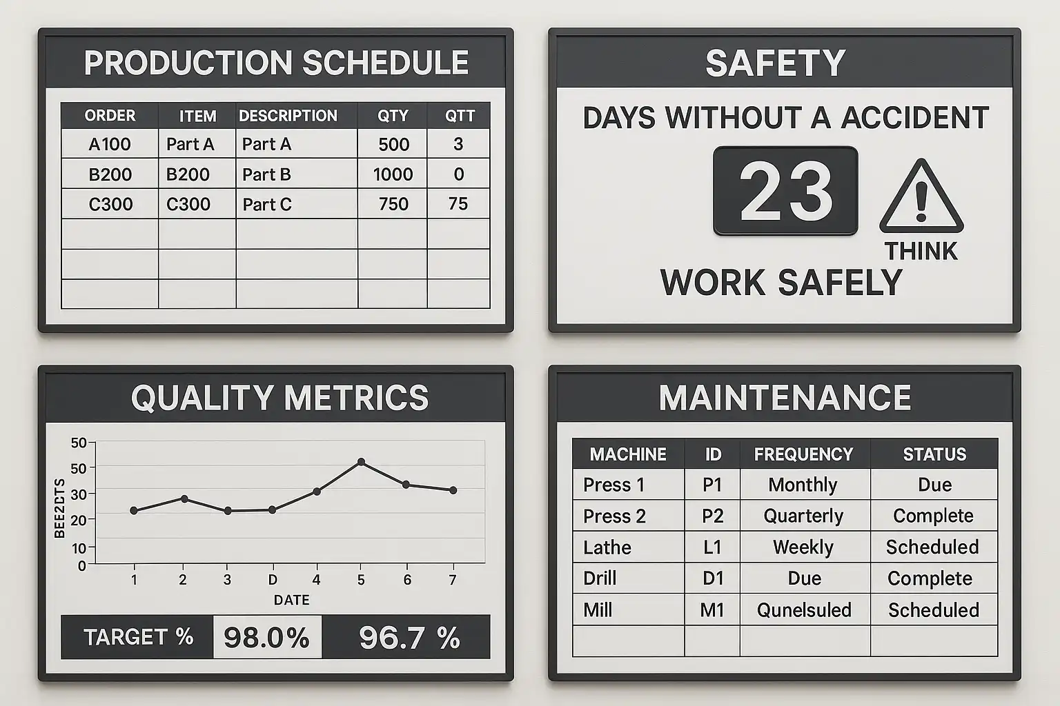 - 质量管理看板:统计不良品率、返工率及质量检验结果,保障产品质量。