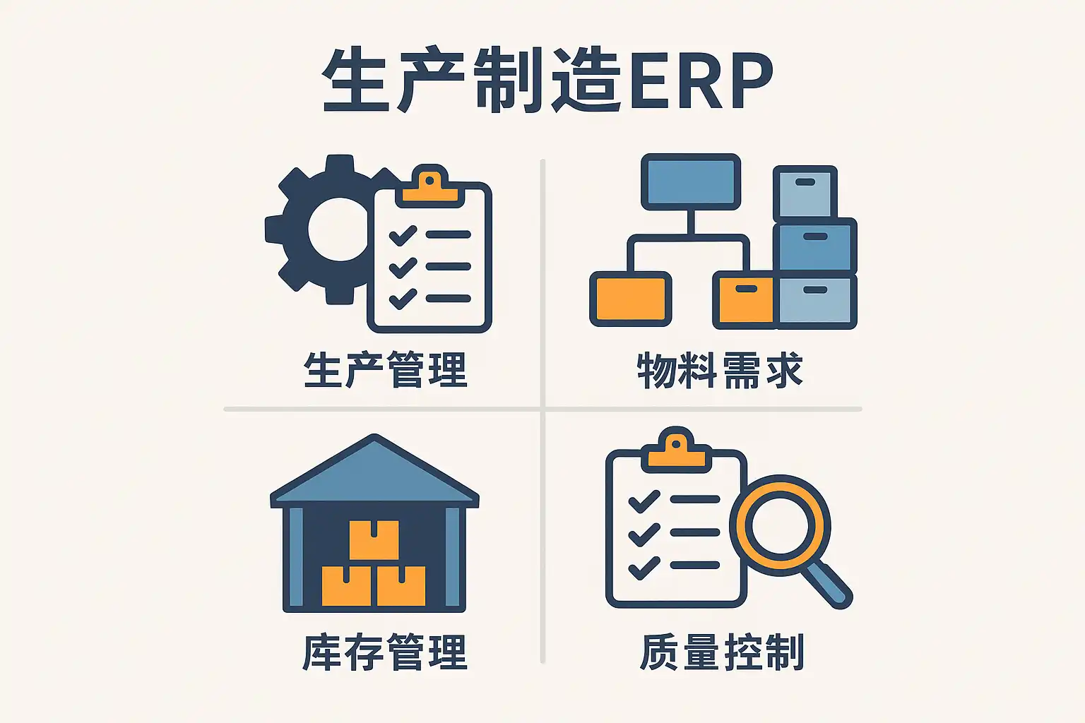 生产制造ERP系统集成了企业生产管理的各个环节,覆盖从原材料采购、库存管理、生产计划、质量控制到订单交付的全过程。以下是生产制造ERP主要功能及对应应用场景: