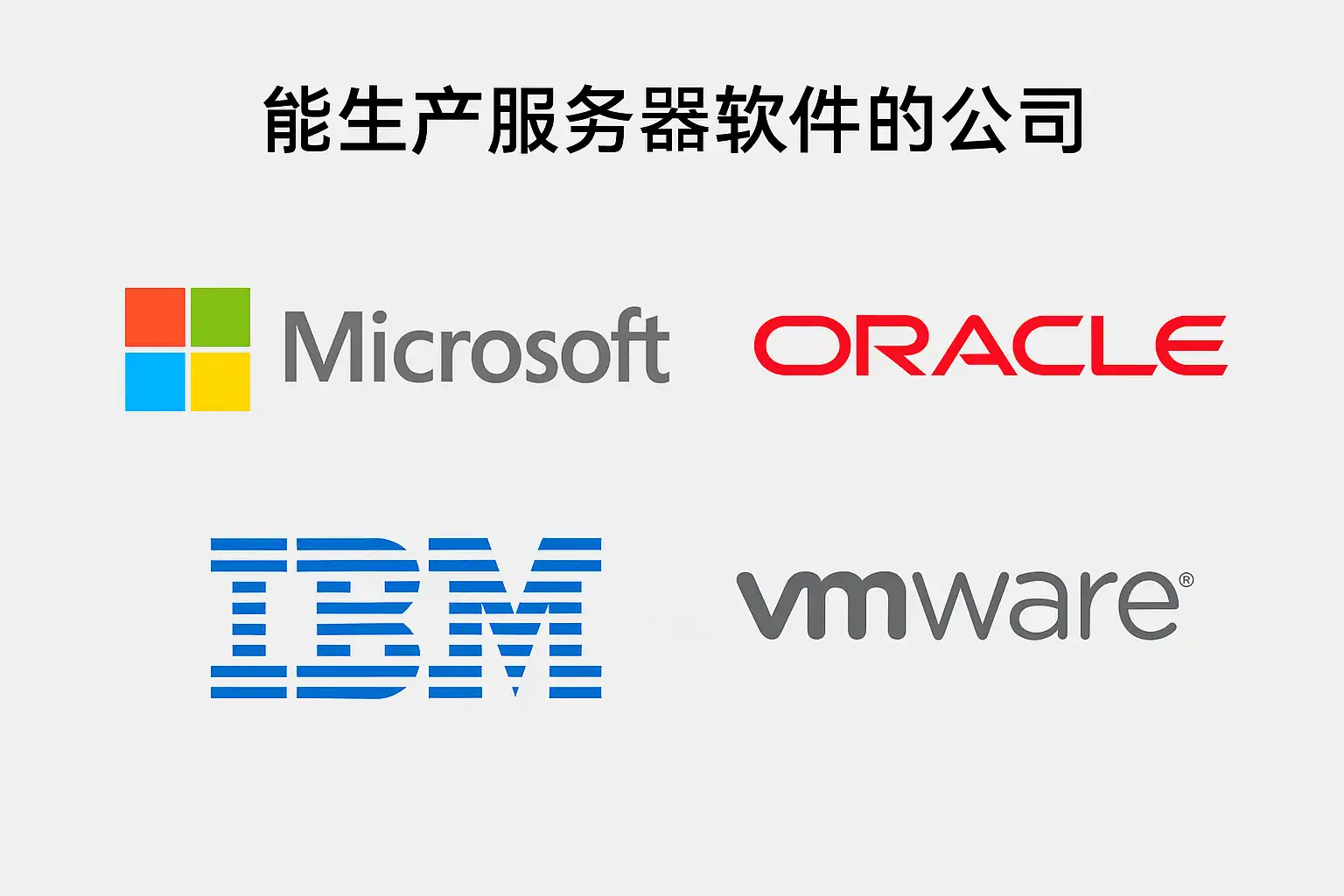 | 国际巨头 | 微软(Microsoft)、IBM、甲骨文(Oracle)、Red Hat、VMware | Windows Server、IBM WebSphere、Oracle Database、Red Hat Enterprise Linux、VMware ESXi |