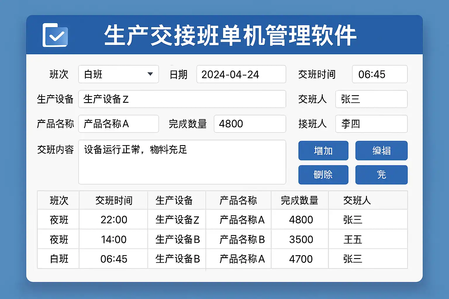 生产交接班单机管理软件通过实现数据实时同步、自动生成交接班记录和异常报警功能,显著提升生产效率。具体功能包括: